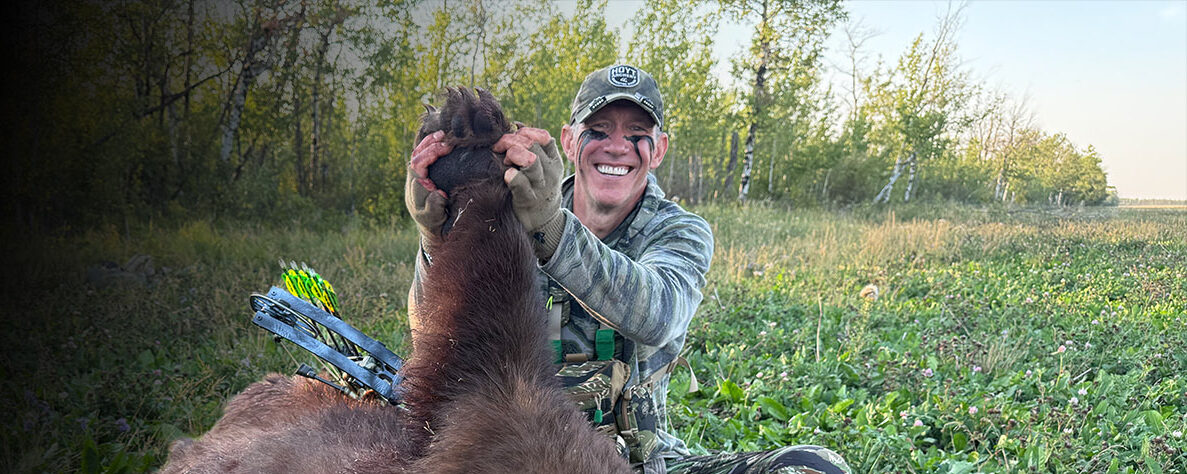 Opening Day in Alberta gets HEAVY quick with a monster chocolate bear! The new Hoyt RX10 and G5 T2 broadhead made quick work of this beast at 40 yds. While covering miles looking for mule deer we spotted a bear feeding along the timber edge about a mile out. We used a pipeline burn to shield us as we closed the gap. As we set up for the interception it became obvious this bruin was not only a belly dragger but he was also color phased. This fall bear was pushing 8′ nose to tail with a monster skull. I was hunting with Red Willow Outfitters, Alberta Canada contact (780) 300-1111
