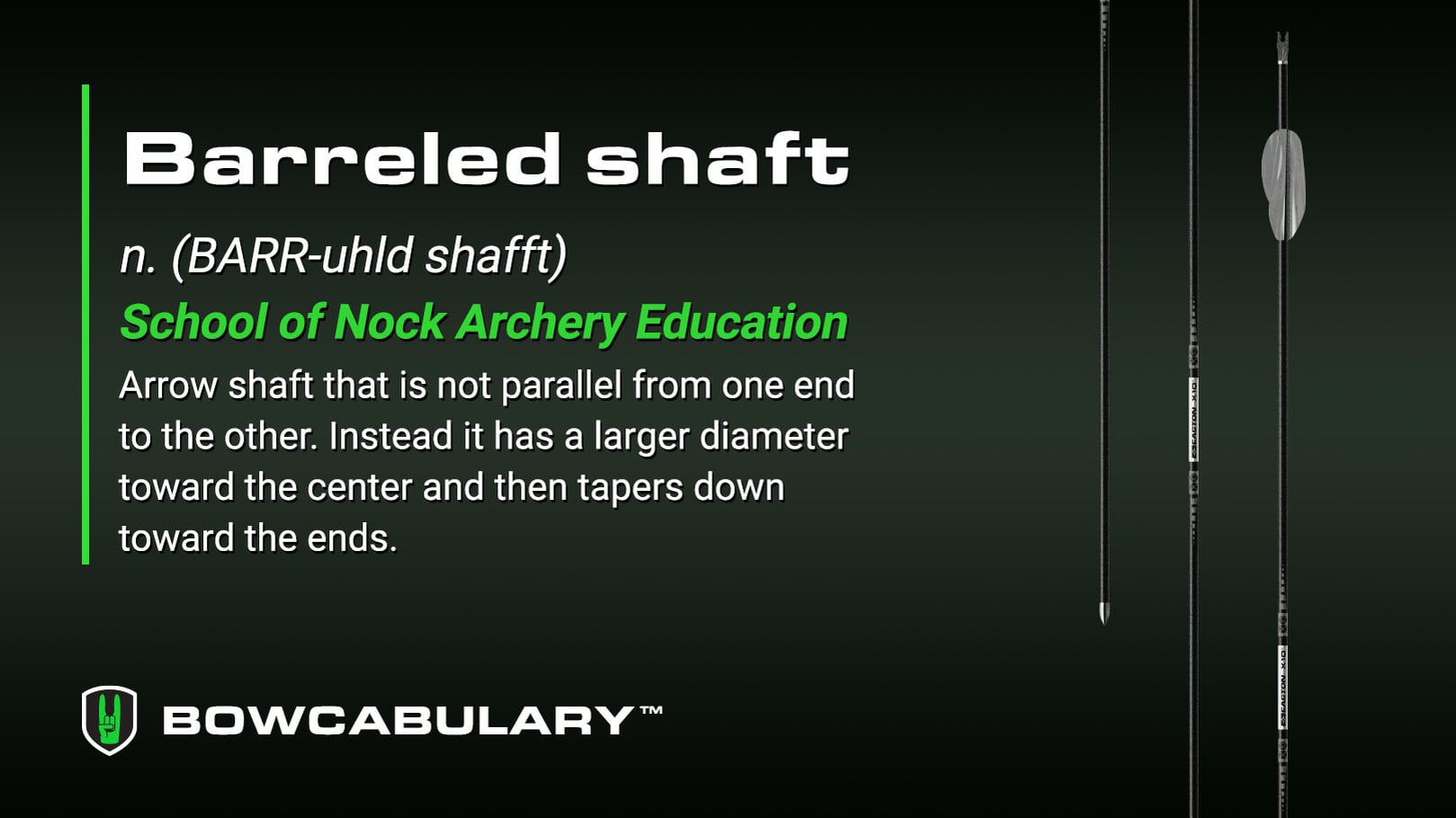 A barreled shaft is an arrow shaft that is not parallel from one end to the other. Instead, its diameter is largest toward the center and tapers down toward both ends. Think of a whiskey barrel, and you’ve got the picture. THESE ARROWS ARE EXTREMELY ACCURATE IN LONG RANGE WEATHER CONDITIONS.