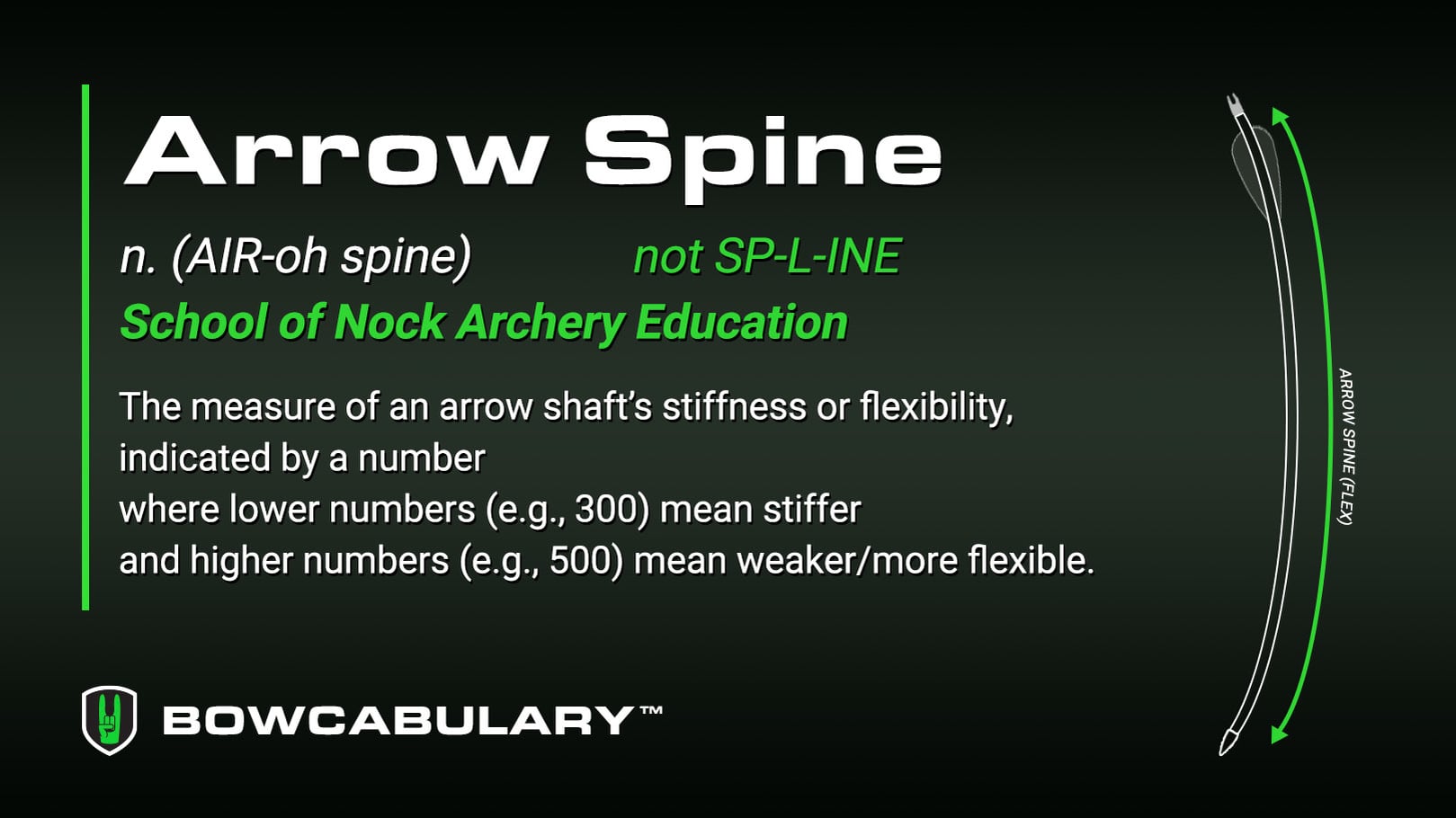 Spine measures an arrow shaft’s stiffness or flexibility. A number printed on the shaft indicates the spine rating: lower numbers (like 300) mean stiffer, while higher numbers (like 500) mean weaker and more flexible.